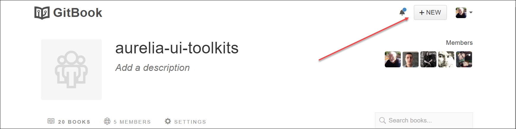 Point your browser to our GitBook main page: https://www.gitbook.com/@aurelia-ui-toolkits and click on the + NEW button (Image 1, below)