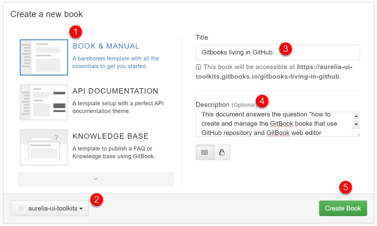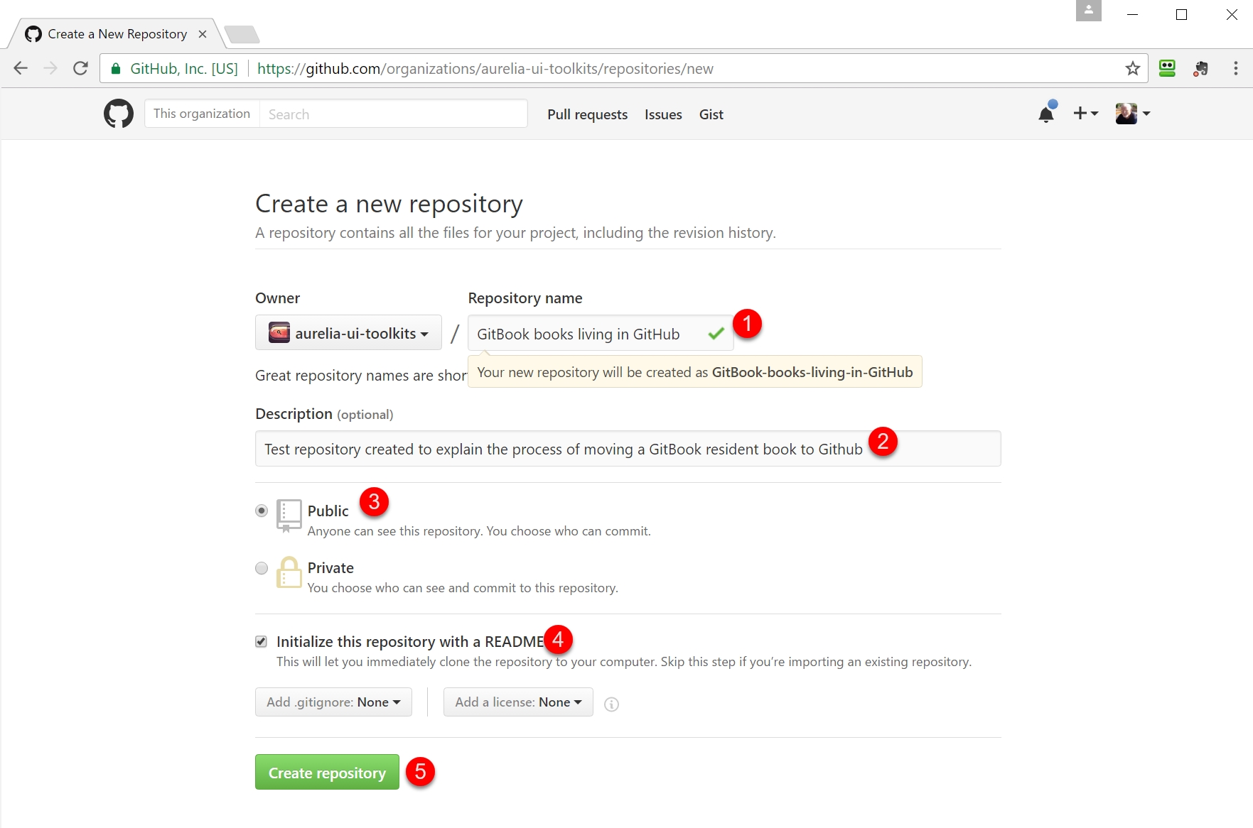Click on Create repository buttom (marker 5, Image 4) results with the new GitHub repo with the URL https://github.com/aurelia-ui-toolkits/GitBook-books-living-in-GitHub