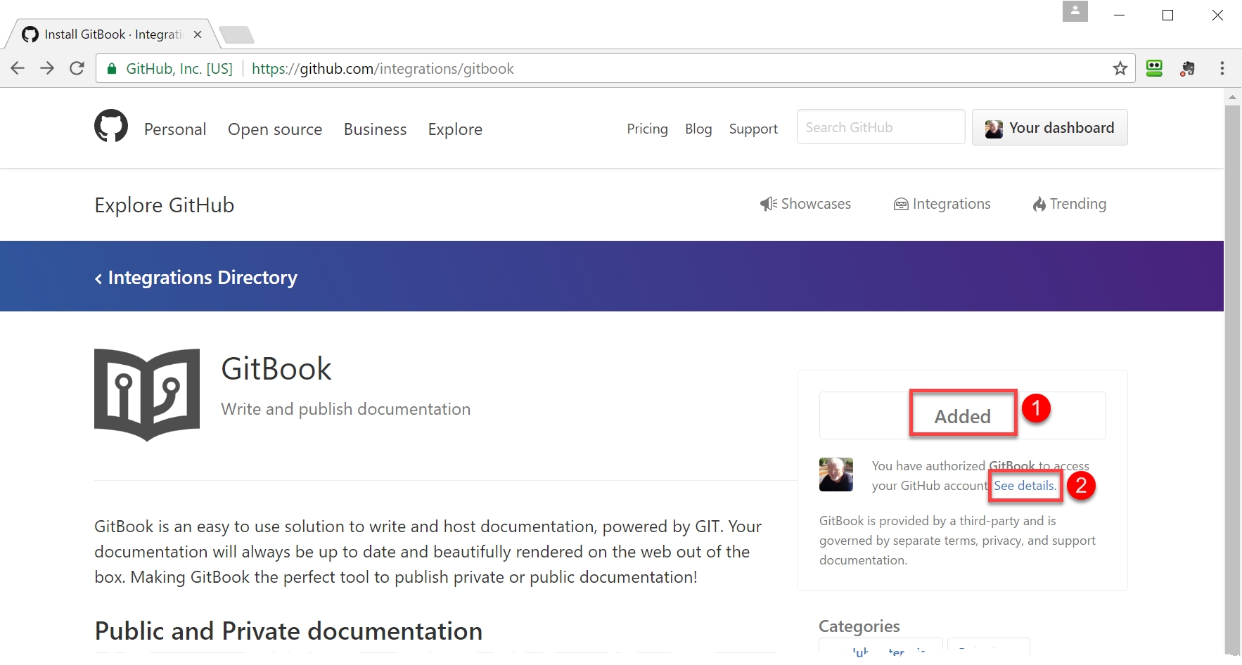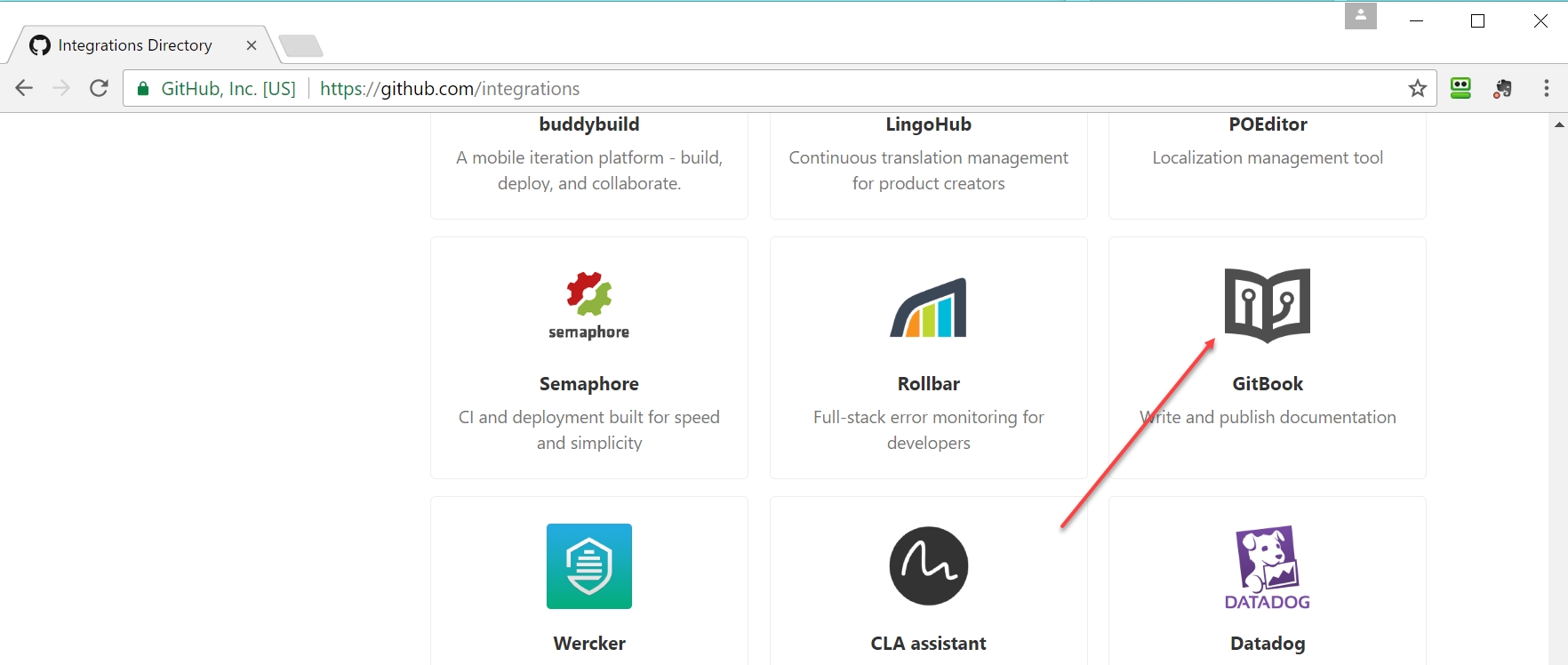 Click on the Browse directory icon (Image 6, marker 1) will bring the list of all GitHub integrations. Scroll down until you see the GitBook icon