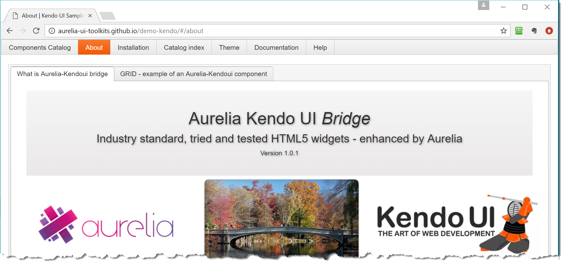 This application is envisioned as a source of all information about the Aurelia KendoUI bridge plugin, organized as a collection of pages accessible via the main menu, shown above.
