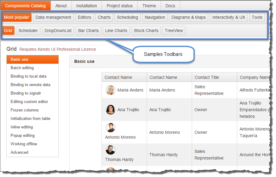 The click on Components Catalog menu item (left-most, shown on Image 1 above), followed by the click on Most popular and click on Grid button results with the Aurelia KendoUI Controls Catalog rendering the KendoUI basic grid sample. In addition to rendering the grid, the Aurelia KendoUI Controls Catalog also shows the Samples Toolbar, which shows all categories of controls, with the GENERIC category being select as default.