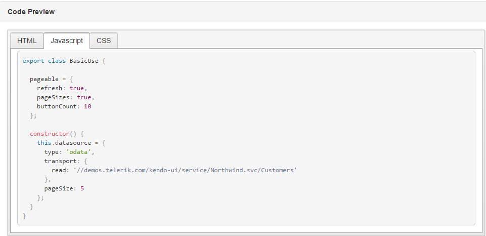 Each of the page showing a KendoUI control converted to an Aurelia component, has the section that shows the component's view and view model. Here are three consecutive screen-shots showing that information for the Sample grid control on Image 1 above.