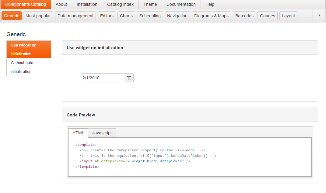 The Components Catalog is the most often used section of this app. It renders the default view (shown below as Image 1), specifically chosen to point out the "widget auto initialization" issue, which is a very frequent subject of discussion in Aurelia KendoUI chat room