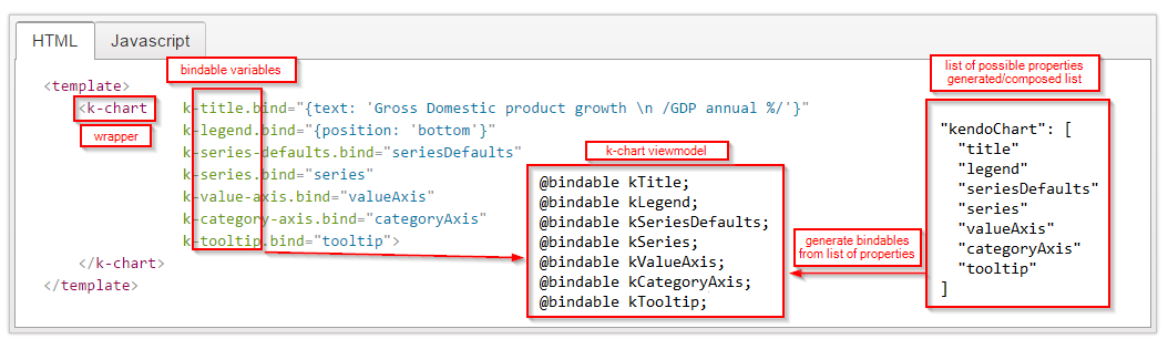 In order to reduce the amount of code we have to write per wrapper, we use the @generateBindables decorator introduced in the Generation of bindable properties note. This decorator generates @bindable properties based on a list of strings, which is actually a list of properties that each Kendo control supports. So we need to maintain a list of possible properties per Kendo control.