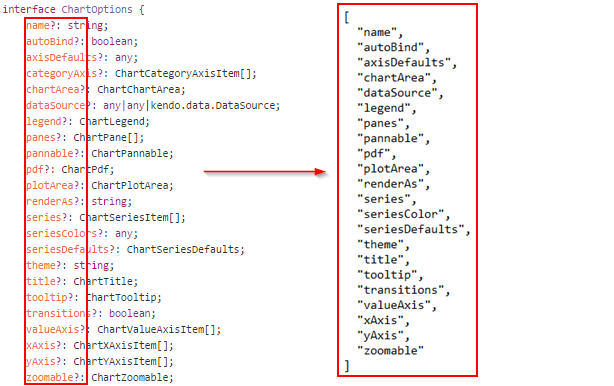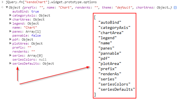 This object contains both keys (autoBind, categoryAxis) and values (true, "chart"). We only care about the keys of this object, which gives us a list of properties that the Kendo control allows. However, this list is not always complete, so we need to augment this list with some other source.