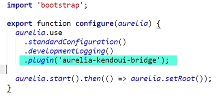 Add the request to load the aurelia-kendoui-bridge plugin by adding the highlighted statement below (.plugin('aurelia-kendoui-bridge');