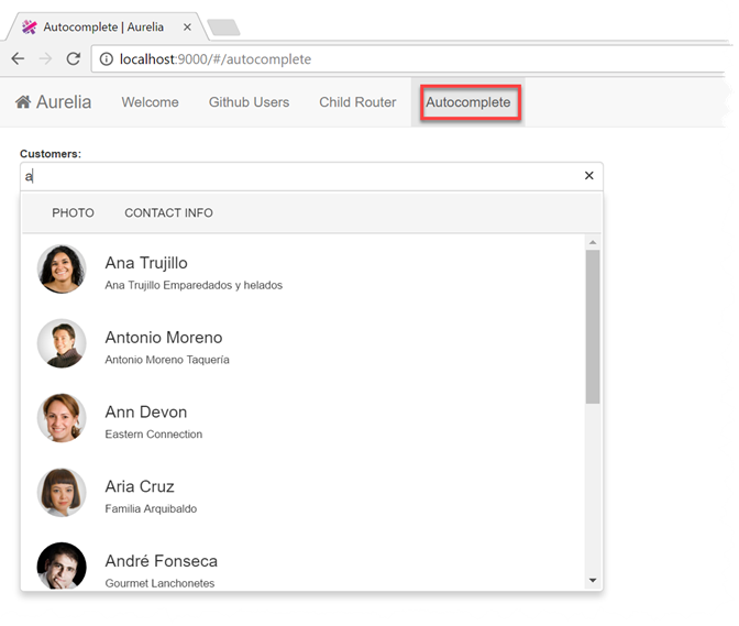The tutorials show how to add the Aurelia KendoUI bridge catalog's autocomplete sample where the actual code, building tools and internal organization of each sample varies across these six tutorials: The screenshot below depicts the modified navigation skeleton application "sporting" the added Autocomplete menu item