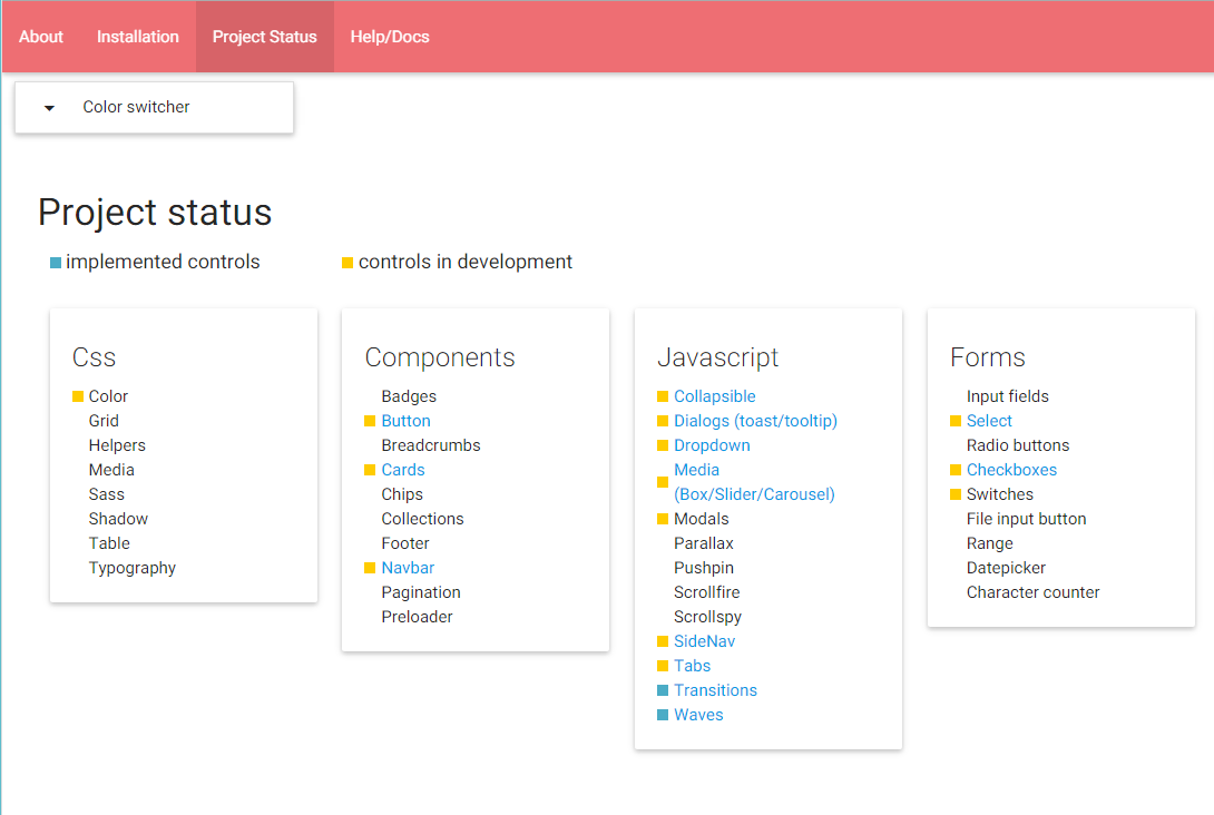 The click on Project status menu item (as shown on Image 1 above) results in showing the Aurelia Materialize bridge components overview. Clicking on one of the components, a sample page is shown, containing a basic use example and more insteresting options along with a side-nav navigation on the left edge, showing the other available components.