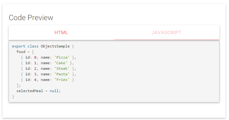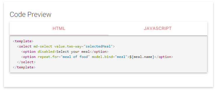 Each of the page showing a Materialize control converted to an Aurelia component, has a section that shows the usage of the component (the consumer's view) along with optional view model and css options.