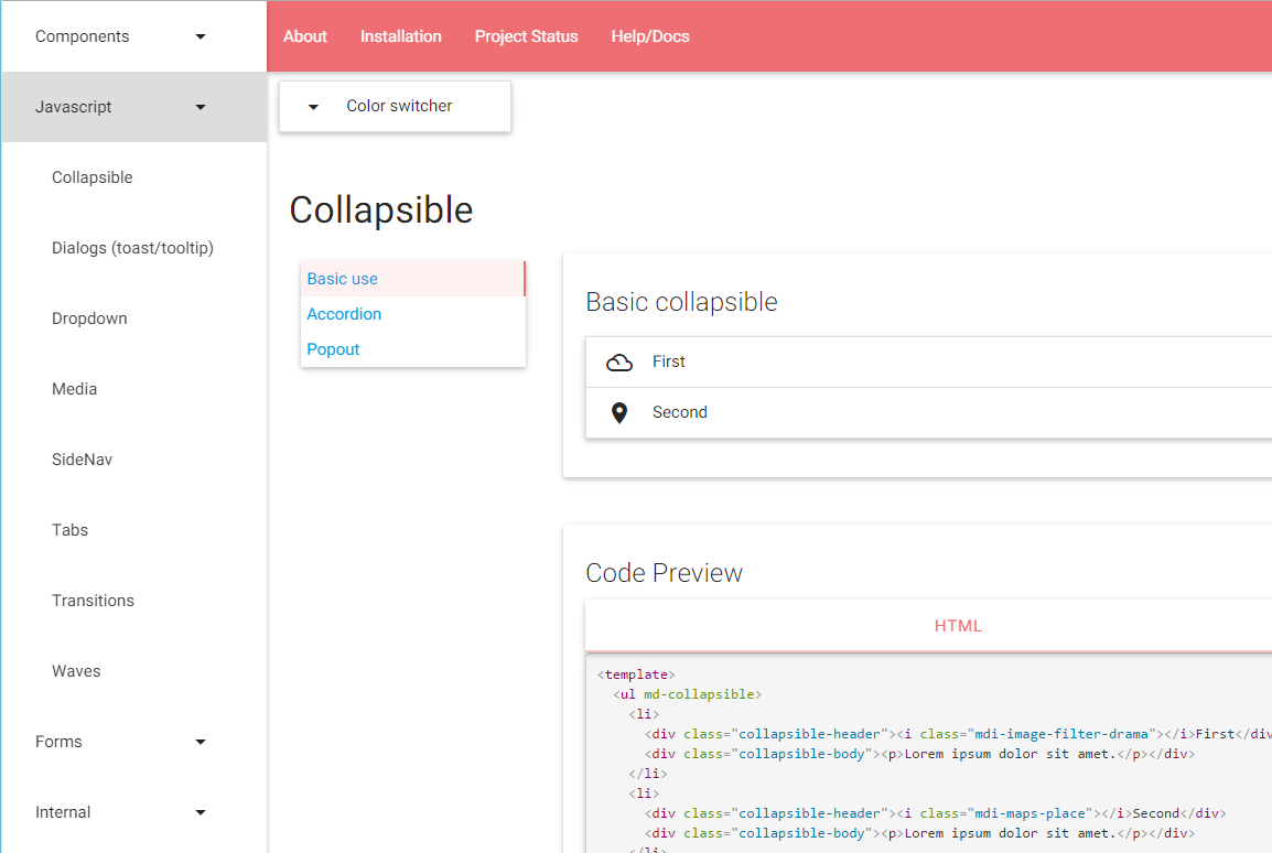 Selecting the Collapsible side-nav item, results with the view of the collapsible page of this catalog (as shown above).