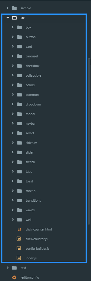 The plugin's src folder contains the common subfolder with utilities used by more than one Materialize component "wrapped" by this plugin. In addition to the just described utility of the common folder, the src folder contains a subfolder for each of the Materialize components that is wrapped by this plugin.