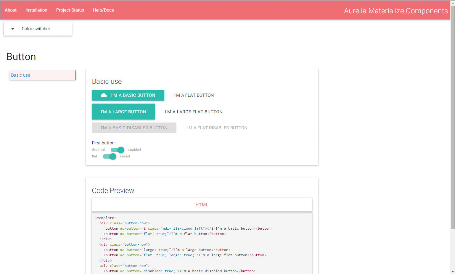 Image 3 #### Color codes: * **orange**: Materialize controls hosted by this sample app (these controls are the consumers of the Aurelia-Materialize-Bridge) * **blueish**: Standard Aurelia application files collection #### Sample application showing the Materialize Button control: