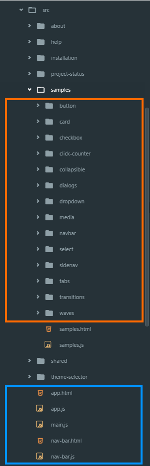 As mentioned before Aurelia-Materialize-Bridge has a special structure, with the plugin consumer application being a part of the same project (see the content of the blue rectangle on the image 3 below)